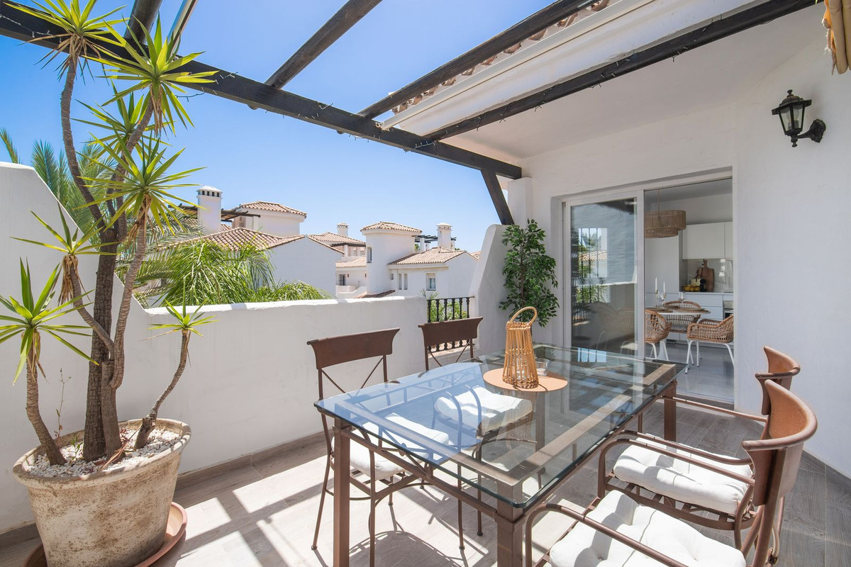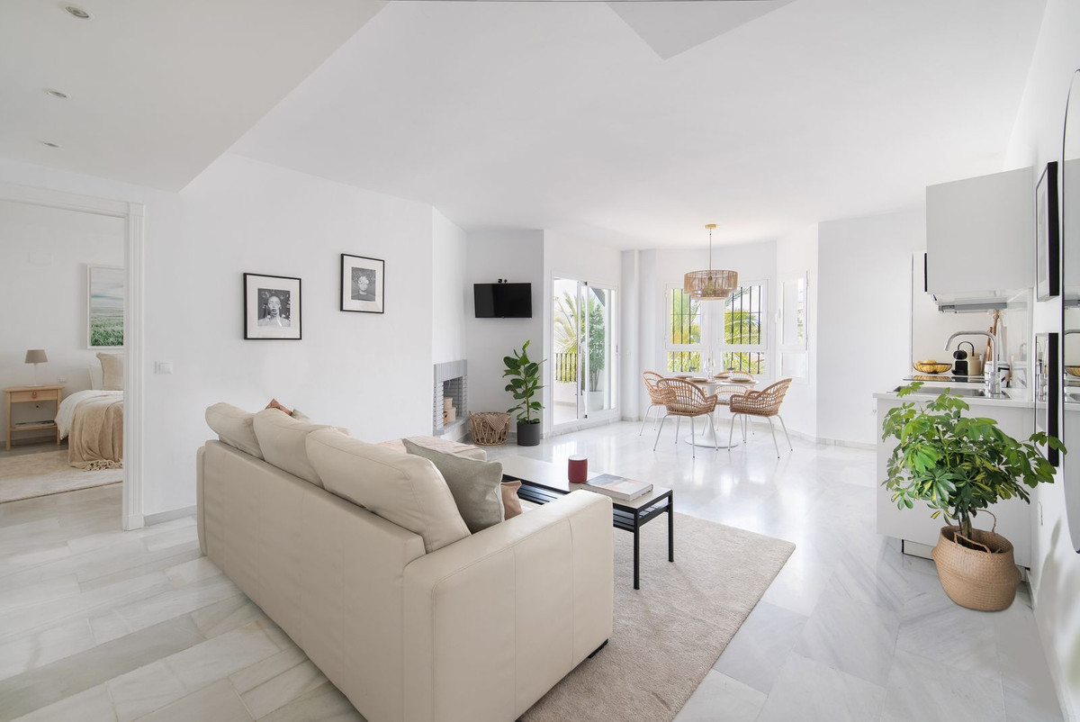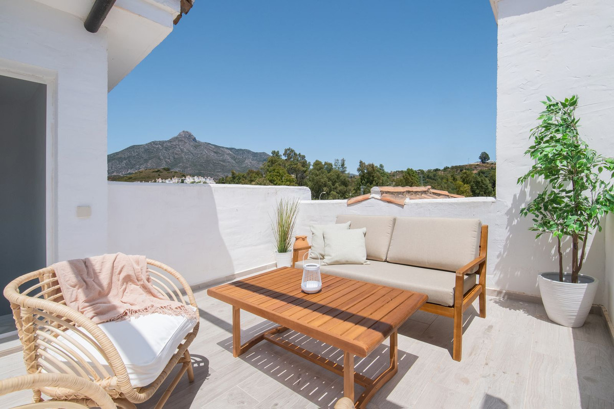 Apartamento ático en venta en Los Naranjos de Marbella con 2 dormitorios en una ubicación muy céntrica en el corazón de Nueva Andalucía. Este apartamento ha sido reformado con un alto nivel, el interior consta de una luminosa sala de estar, comedor y cocina, chimenea, dos dormitorios y dos baños. En el exterior hay una gran terraza fuera de la sala de estar con espacio para comer al aire libre, y también hay una terraza en la azotea con vistas espectaculares de la montaña “La Concha” y los alrededores donde puede relajarse y hacer una barbacoa. La urbanización tiene cuidados jardines andaluces con varias piscinas comunitarias. En la misma zona hay un gran supermercado, restaurante, cafeterías y un estudio de yoga a pocos minutos andando. Luego también puede dar un corto paseo de 20 minutos a Puerto Banús o a la playa. ¡Esta propiedad es una visita obligada! ¡Es ideal para vivir todo el año o para alquilar ya que la ubicación es ideal!